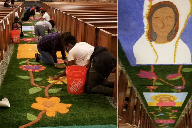 El P. Marinello Saguin, párroco de la iglesia, contó a ACI Prensa que es la primera vez que elaboran estas alfombras de origen centroamericano.