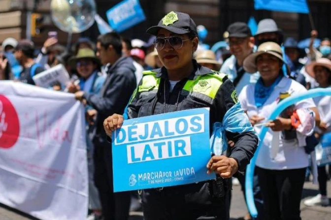 "¡Déjalos latir!" y "¡El aborto no es salud", se puede leer en el cartel que levantó emocionada la policía mexicana durante la manifestación, que colmó las calles del centro de Ciudad de México el sábado 7 de mayo, convocada por la plataforma Pasos por la Vida.