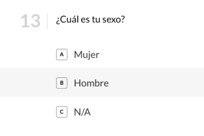 Sin embargo, el punto más criticado fue que en la pregunta 13 se plantee una tercera respuesta a "¿Cuál es tu sexo?" además de "Mujer" y "Hombre": "N/A".