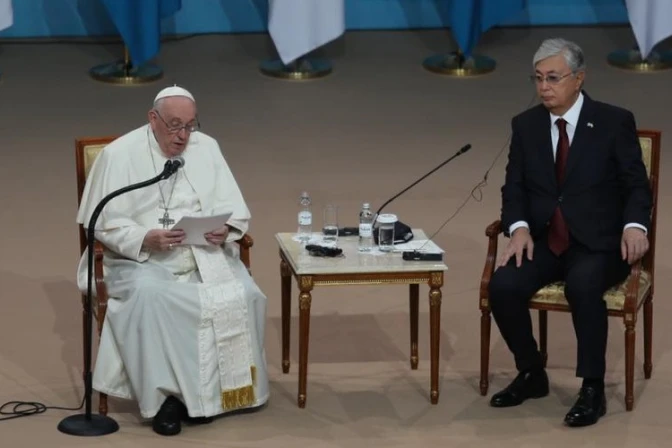 En su primer discurso en la "Sala de Conciertos Qazaq", a la que el Papa Francisco llegó en silla de ruedas desde el Palacio Presidencial, -recorriendo una distancia de 500 metros junto al presidente-, explicó que ha viajado hasta el país de Asia Central "como peregrino de paz, en busca de diálogo y unidad".