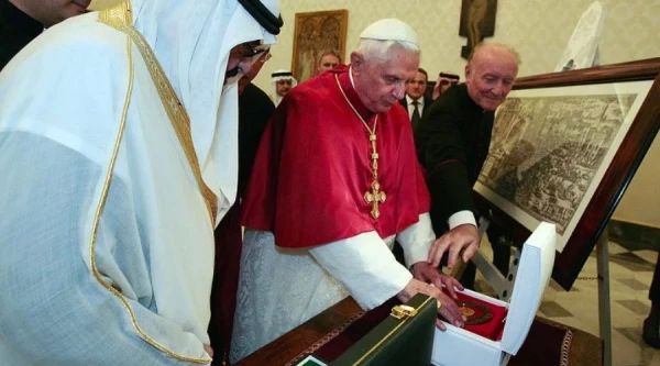 El Papa Benedicto XVI intercambia regalos con el rey Abdullah de Arabia Saudita (izquierda) en el Vaticano, el 6 de noviembre de 2007. Crédito: POOL/AFP vía Getty Images.