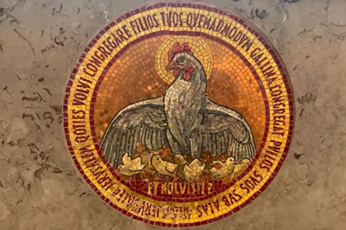 En su video, el sacerdote mexicano indica que en la iglesia Dominus Flevit "encontramos en el altar esta imagen que representa a una gallina con sus polluelos y tiene el texto que dice: 'Jerusalén, Jerusalén yo quise congregarte como la gallina congrega a sus polluelos pero tú no quisiste'".