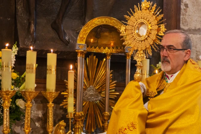 Al término de la Misa, se realizó una solemne procesión y el Corpus Christi recorrió nuevamente tres veces el perímetro del edículo. Luego, el Patriarca Pizzaballa, portando la custodia, entró con el Santísimo Sacramento hasta donde está la tumba del Señor resucitado.