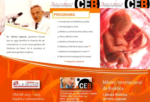 El Centro de Estudios Biosanitarios (CEB) con sede en Madrid (España), anuncia el inicio del Máster Internacional de Bioética online, Cátedra Bioética Jérôme Lejeune, que ofrece al alumno una visión multidisciplinar de la bioética personalista, a través de las bases del conocimiento científico, filosófico y jurídico para dotar a la persona de herramientas y estrategias necesarias para desarrollar trabajos de investigación en este campo.