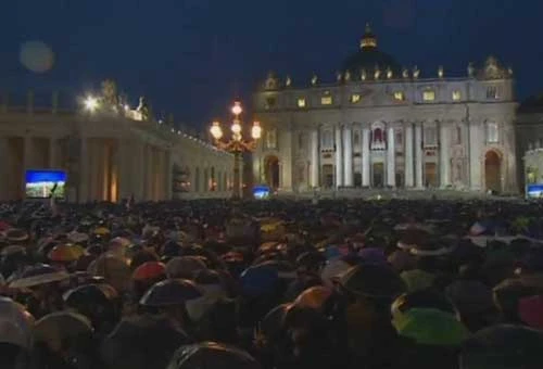 Peregrinos de todo el mundo aguantan bajo la lluvia para tercera fumata