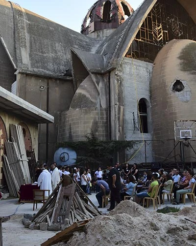 El Prelado afirmó que hoy celebramos la reconstrucción de esta iglesia y "nuestra voluntad de permanecer aquí, en nuestra tierra y país".