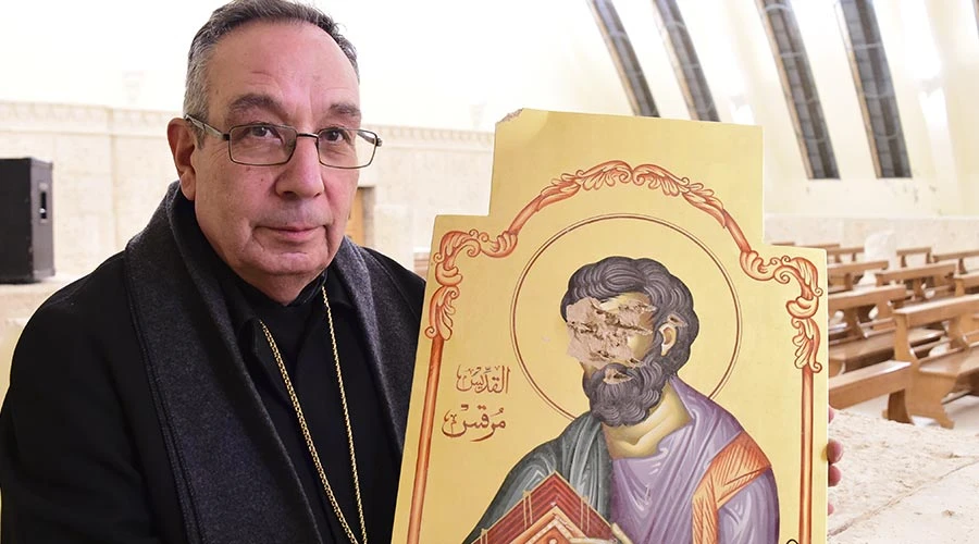 Mons. Jean-Abdo Arbach sosteniendo uno de los iconos destruidos / Foto: Cortesía ACN