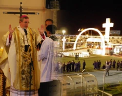 Ante la Cruz de la Evangelización, la primera traída por los misioneros españoles a tierras peruanas y acompañado de diversos obispos presentes para este importante evento, el Arzobispo de Piura y Tumbes explicó que el desafío de este Congreso Eucarístico, en este tercer milenio, está en "tomar sin vacilaciones la cruz, de atraerla fuertemente a nuestro pecho, de comprometernos generosamente con Cristo en su Iglesia y ser los misioneros, los apóstoles, los testigos que nuestra Piura y nuestro Tumbes necesita".