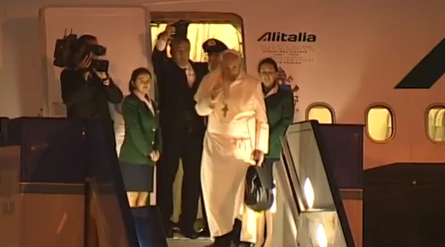 El Pontífice abordó el avión a las 16:54 (hora local) y, como ya es costumbre, subió las escalinatas hasta el avión con su famoso maletín negro.