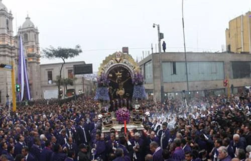 La venerada imagen del Señor de los Milagros avanza en procesión por las calles del centro de Lima en Perú, con dirección a la Catedral local en donde se celebrará el tradicional "Sermón de las Siete Palabras".