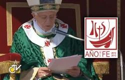 El Año de la fe que hoy inauguramos está vinculado coherentemente con todo el camino de la Iglesia en los últimos 50 años: desde el Concilio, mediante el magisterio del siervo de Dios Pablo VI, que convocó un «Año de la fe» en 1967, hasta el Gran Jubileo del 2000, con el que el beato Juan Pablo II propuso de nuevo a toda la humanidad a Jesucristo como único Salvador, ayer, hoy y siempre. Estos dos Pontífices, Pablo VI y Juan Pablo II, convergieron profunda y plenamente en poner a Cristo como centro del cosmos y de la historia, y en el anhelo apostólico de anunciarlo al mundo. Jesús es el centro de la fe cristiana. El cristiano cree en Dios por medio de Jesucristo, que ha revelado su rostro. Él es el cumplimiento de las Escrituras y su intérprete definitivo. Jesucristo no es solamente el objeto de la fe, sino, como dice la carta a los Hebreos, «el que inició y completa nuestra fe» (12,2).