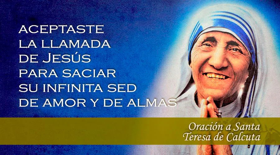 Beata Teresa de Calcuta, deseando ardientemente amar a Jesús como nunca antes había sido amado, te entregaste completamente a Él, sin negarle nada. En unión con el Corazón Inmaculado de María, aceptaste la llamada de Jesús para saciar su infinita sed de amor y de almas y así ser portadora de su amor por los más pobres entre los pobres.
