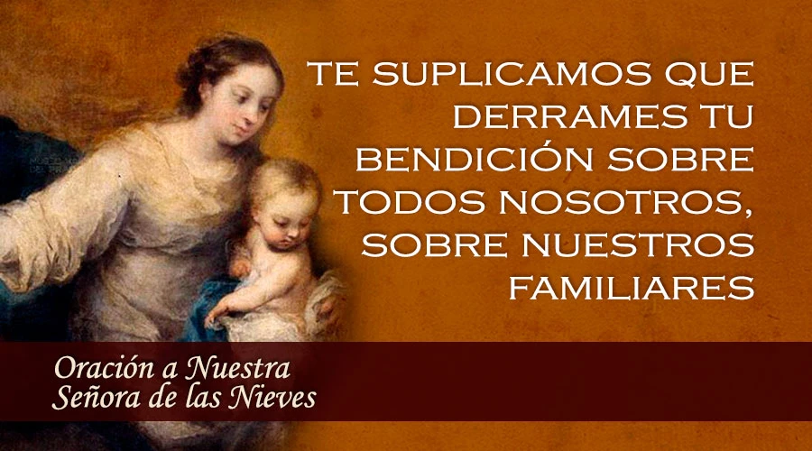 Virgen Santísima de las Nieves, Patrona y Madre Nuestra; postramos ante este trono que nuestro filial amor te ha dedicado entre las bellezas y alturas de nuestras montañas nevadas, te suplicamos que derrames tu bendición sobre todos nosotros, sobre nuestros familiares, sobre los turistas y los alpinistas y que intercedas ante tu Divino Hijo para que nos conceda la gracia de pasar santamente el día de hoy y todos los de nuestra vida y que nos apartes siempre de todo peligro espiritual y corporal.
