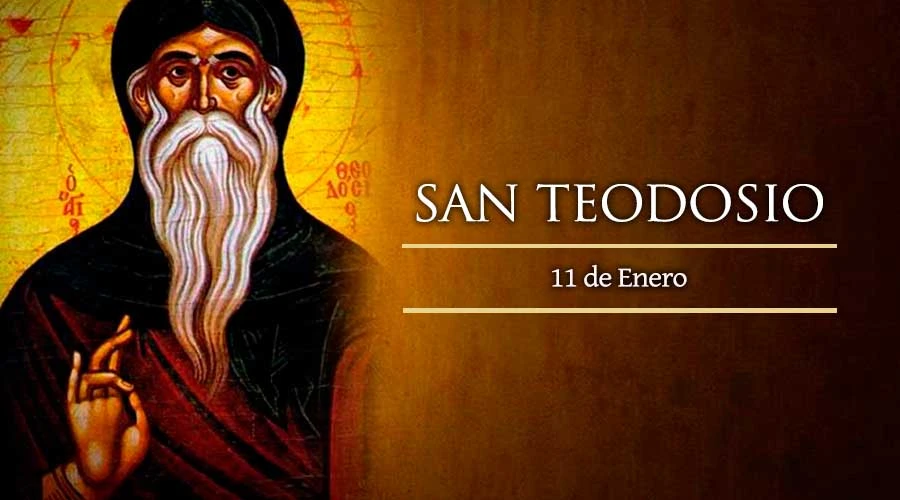 Nació en Turquia en el año 423, y desde pequeño, por inculcasión paterna, leía con mucho fervor las Sagradas Escrituras. Siguiendo el ejemplo de Abraham, el santo decidió dejar sus riquezas y su familia, para peregrinar a Jerusalén, Belén y Nazaret, y luego convertirse en religioso. San Teodosio se fue a vivir no muy lejos de Belén, y tuvo como guía espiritual al abad Longinos. Tras ser ordenado como sacerdote, recibió la orden de encargarse del culto de un templo ubicado entre Jerusalén y Belén. El santo desplegó su labor con mucha sabiduría y humildad, y fue testimonio de una vida santa y llena de oración, lo cual motivó que otros jóvenes también desearan convertirse en religiosos, y más adelante, la fundación de tres conventos en las cercanías de Belén.