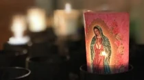 Veladora con imagen de la Virgen de Guadalupe.