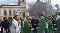 Ante la fachada de la Basílica de San Benito de Norcia, gravemente afectada por los terremotos registrados en esta localidad... Leer más