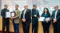 Diego Lu00f3pez Marina de ACI Prensa y la estudiante Milagros Du00edaz Leu00f3n, dos de los ganadores del premio. Cru00e9dito: Conferencia Episcopal Peruana