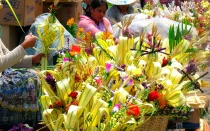Ramos y palmas del Domingo de Ramos en el atrio de una iglesia.
